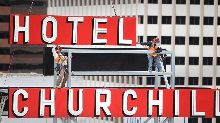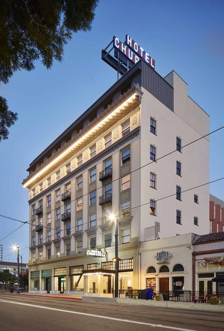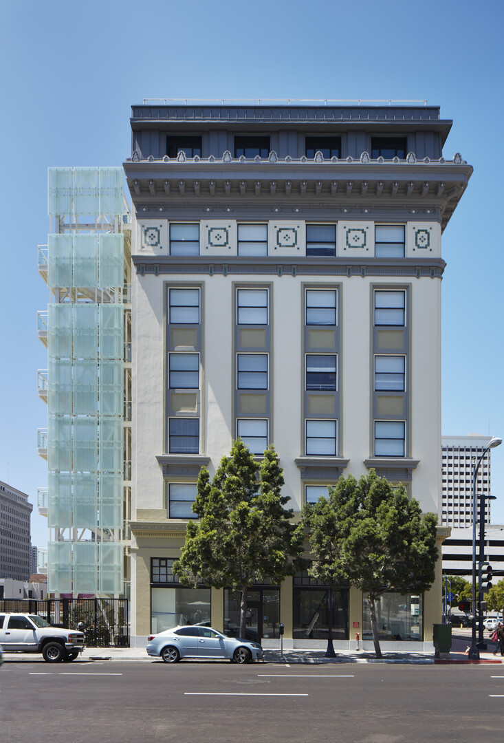 Extensive renovation and restoration of an historic 100+ year-old hotel to create 72 studios for homeless veterans and at-risk youth. The renovation included removing and replacing the unsecured top floor, restoring the existing windows and other numerous historic elements, and installing a unique viscous damper seismic retrofitting system.