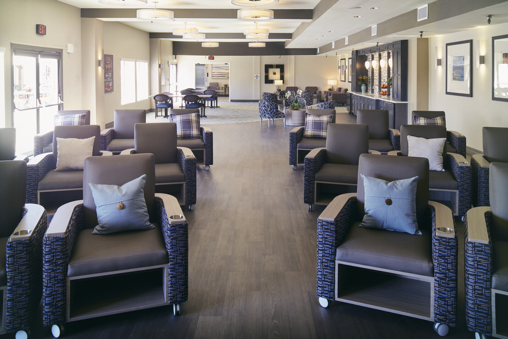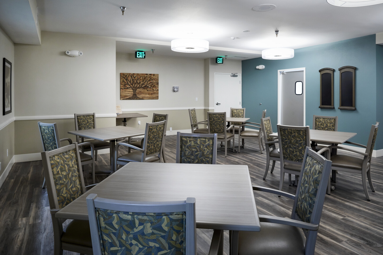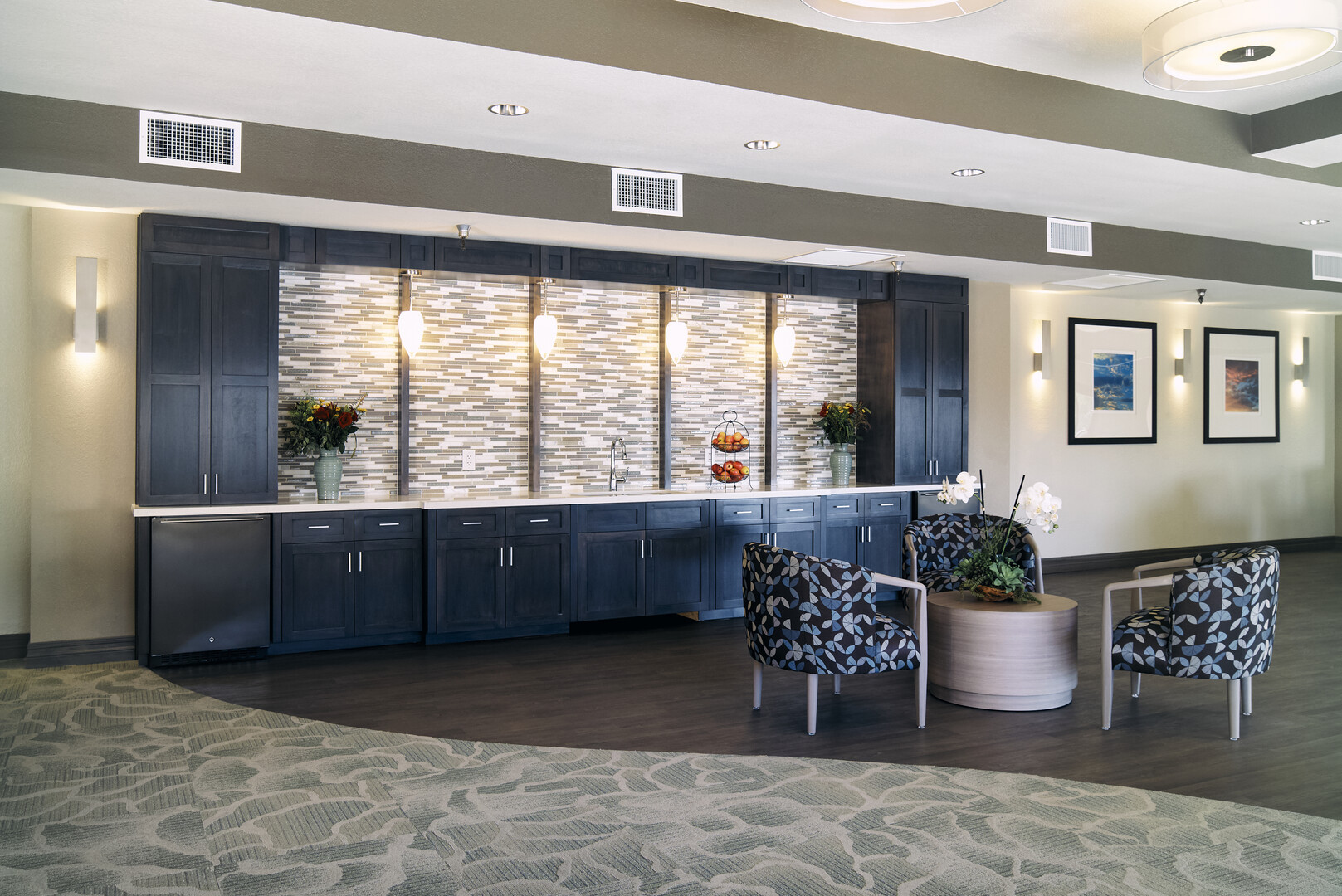 Live-environment renovation of an existing assisted living facility in the La Mesa area of San Diego. Renovations included significant upgrades to common areas, hallways, fitness center, ballroom, and memory care facility.